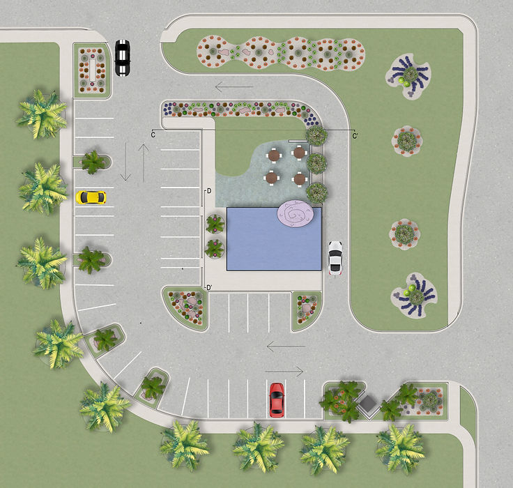 Designed a drive-through restaurant parking lot, for a Conch Republic–themed roadside site, with a digitally driven workflow that balanced circulation efficiency, pedestrian safety, and inviting landscape integration.